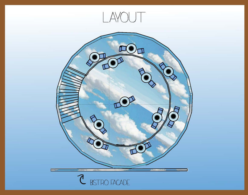 This concept explores the paintings of Magritte by inviting diners into the facade of a bistro against a cloud wall, only for guests to find themselves floating in a blue sky on the other side of the door.